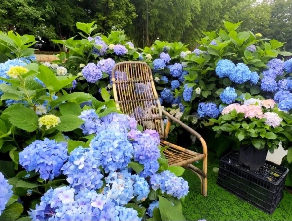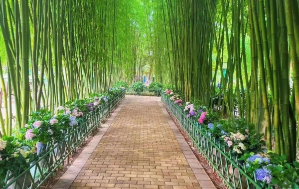 Hydrangea colors change with the pH of the soil, transforming from mystical blue-purple to delicate pink, like a summer "magic show." The park, through artful arrangement of varying heights, simulates a natural floral landscape, creating an immersive, dreamlike scene where "people walk amidst flowers, and flowers move with their shadows." As visitors stroll through the bamboo grove, a gentle breeze brushes their faces, and clusters of hydrangeas bloom profusely, as if they have stepped into a romantic fairy tale world.