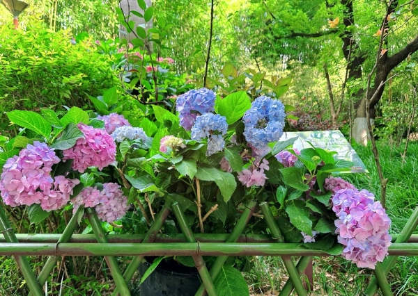为增强游客的互动体验感,公园在竹林岛新增“绣球花径”打卡区。古朴篱笆、翠绿竹子,层叠摆放的绣球盆栽错落有致。游客们穿梭其中,仿佛置身于一幅美丽的油画中,或赏景,或打卡拍照,将绣球花的美丽定格,留下独特的夏日回忆。