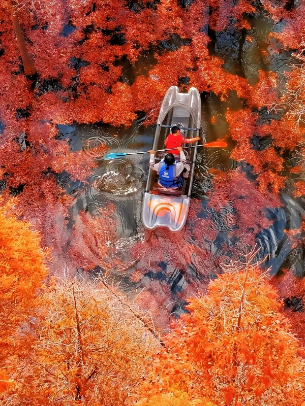 Following Zhang Bichen's footsteps, step into a small glass-bottomed boat and slowly row into the metasequoia forest. Reach out to touch the clear lake water, feel the rhythm of the paddle, and watch the sunlight flow and glint through the branches and leaves. black-headed gulls sometimes glide overhead in flocks, sometimes touch the water's surface, their pure white wings mirroring the reflections of the red trees–this is a dynamic painting that needs no filter, and an immersive "forest breath."