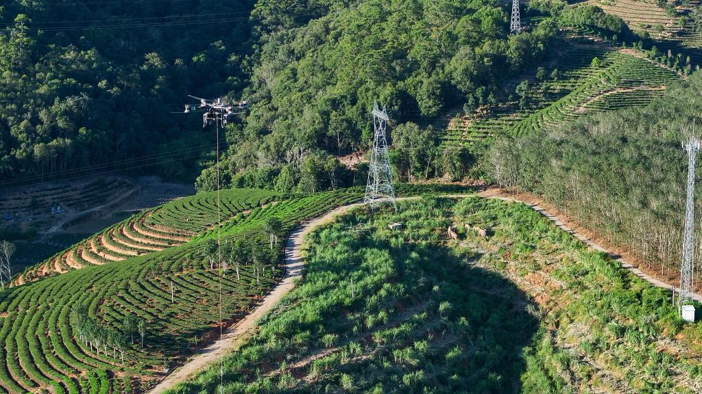 中老500千伏联网工程在施工过程中运用无人机集群作业方式开展施工物资运输。(张强 摄)