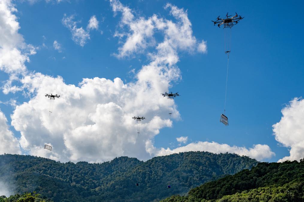 四台重载无人机联合吊运大件物资(无人机照片)。(南方电网供图)