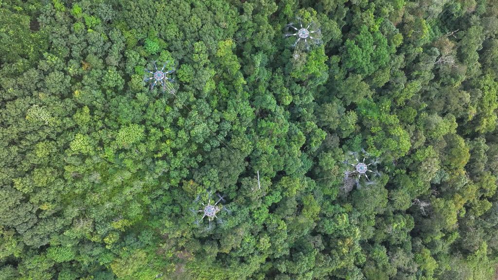 针对大重量运输难题,团队研发出“四机联吊”技术,经过数百次试验调试,攻克多机协同控制、载荷均衡分配等关键技术。目前,“四机联吊”单次运输重量已突破500公斤,创造了单日飞跃高差220米、运输直线距离900米的雨林运输纪录。