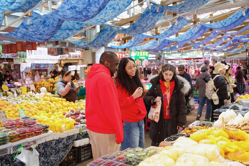 篆新农贸市场里缤纷蔬果整齐铺陈,特色熟食香气四溢。在法国主厨文森特带领下,选手们用流利的中文与摊主交流,将热闹市井变成了生动的中文课堂。