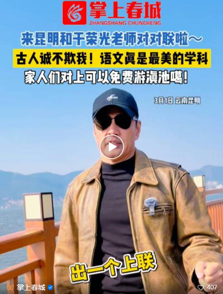 这一次,他不是以“硬汉”形象出现,而是一位在昆明滇池边吟诗作对的“文化发起人”。视频里,他身后是昆明的蓝天碧水和远处的西山,以眼前之景出上联,邀请路过的市民和网友对答。